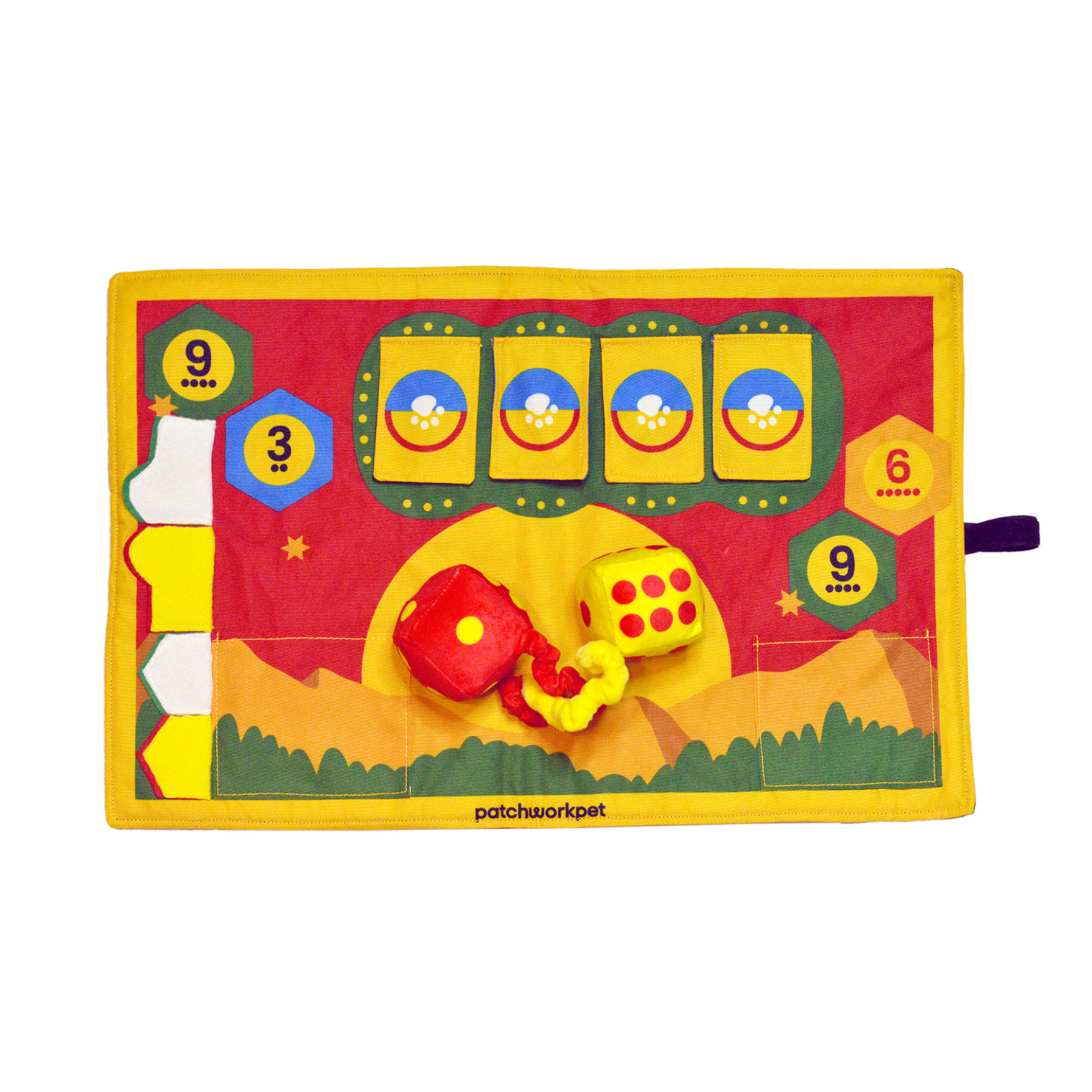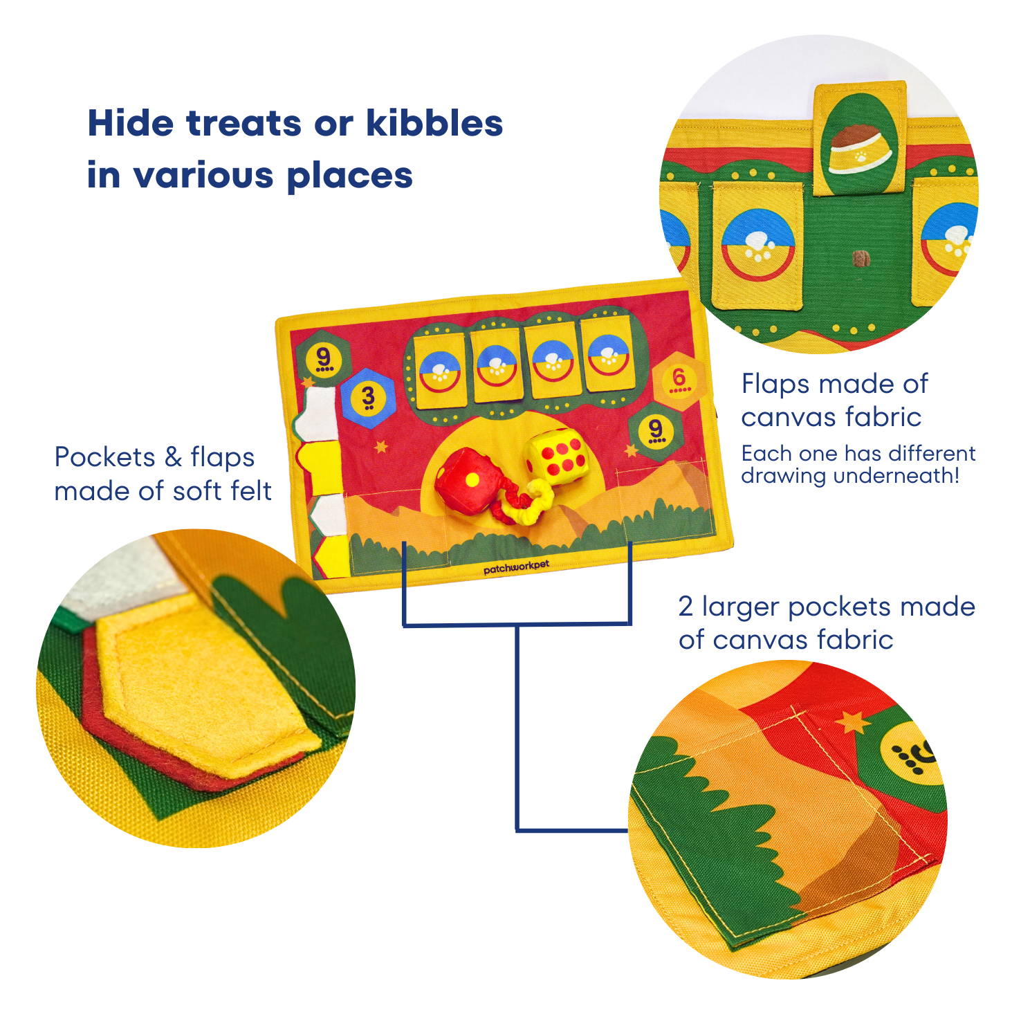 Designed with durable canvas fabric and felt fabrics, this mat has various flaps and pockets for hiding dry food and treats for a a fun game of treasure hunting!