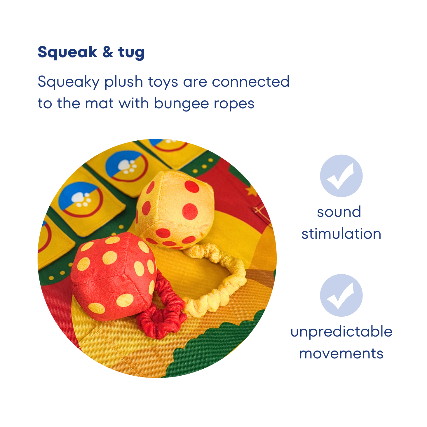 The attached plush toys with squeakers will induce curiosity and provide additional stimulation for your pup.