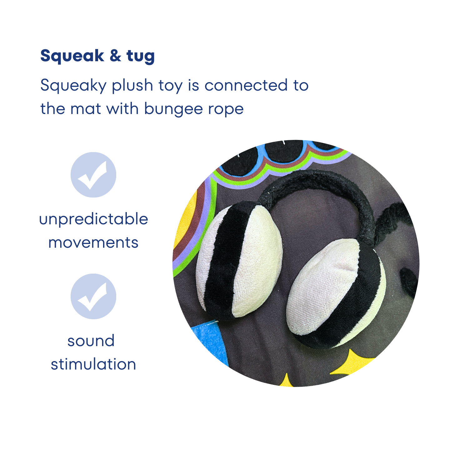 The attached plush headphone with squeakers will provide additional stimulation for your pup.