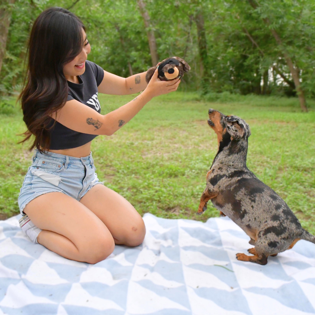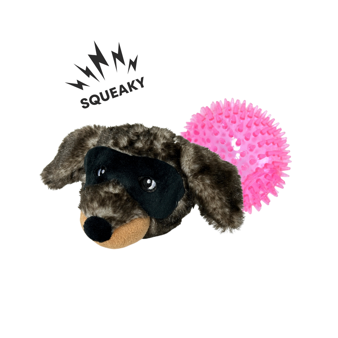 It will provide a longer lasting play with double-stitched seams, reinforced fabric, and a tough prickly rubber ball inside.