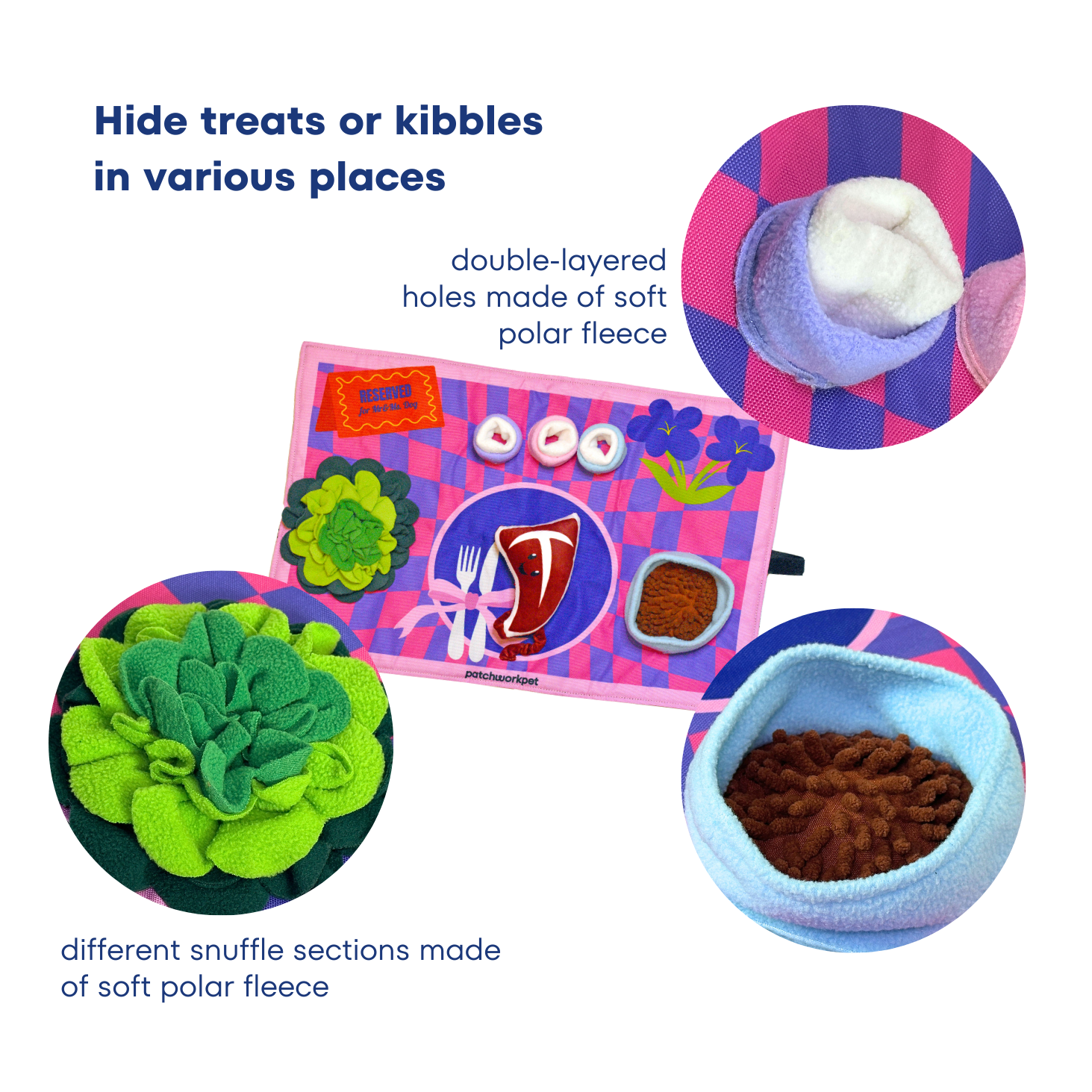 Designed with durable canvas fabric and soft fleece fabric, this mat has various flaps and holes for hiding dry food and treats for a a fun game of treasure hunting!