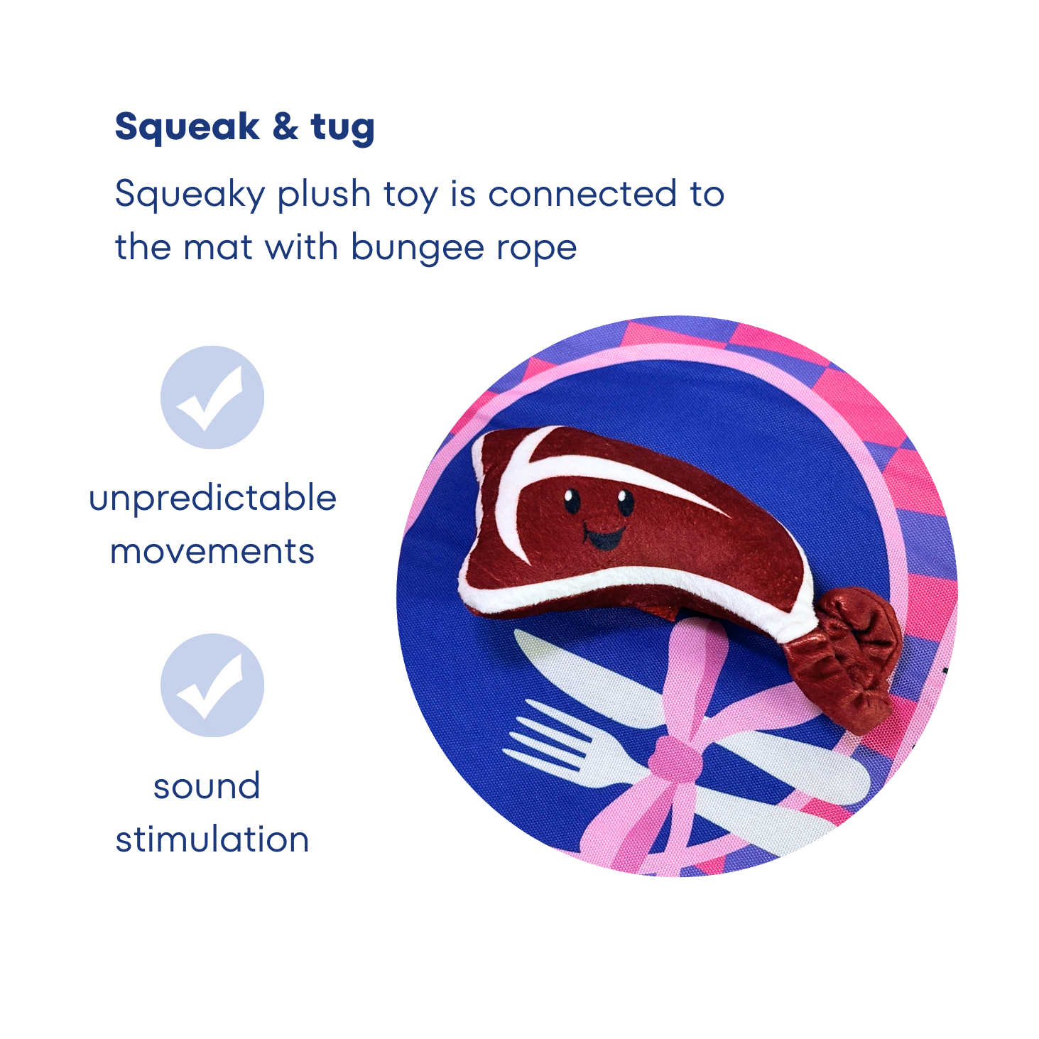 The attached plush steak toy with squeaker will provide additional stimulation for your pup.