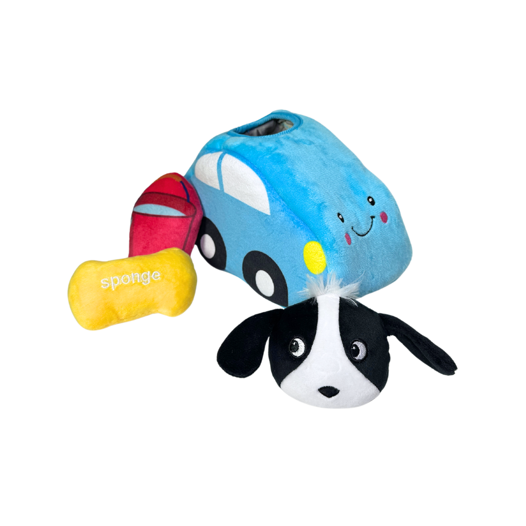 This set includes 3 squeaky plush toys—Einstein, a sponge, and a water bucket—along with a plush pouch.